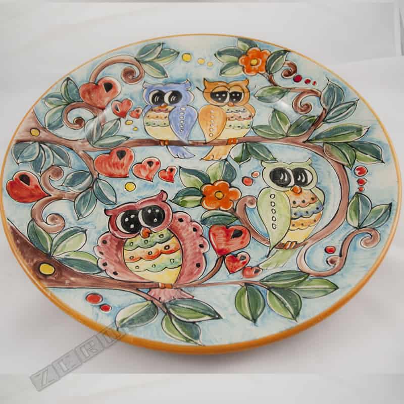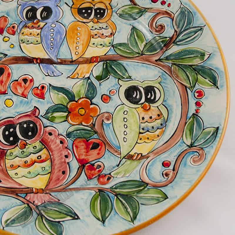 Piatto piano in terracotta con motivo Le Civette dipinto a mano